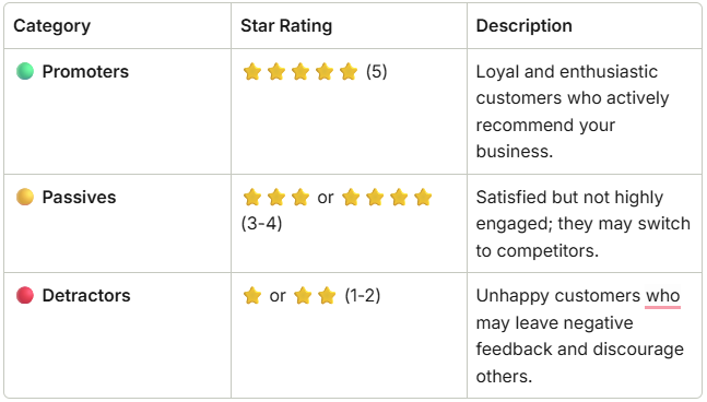 Localyser’s NPS is calculated based on customer star ratings across all review platforms. Customers are categorized into three groups: