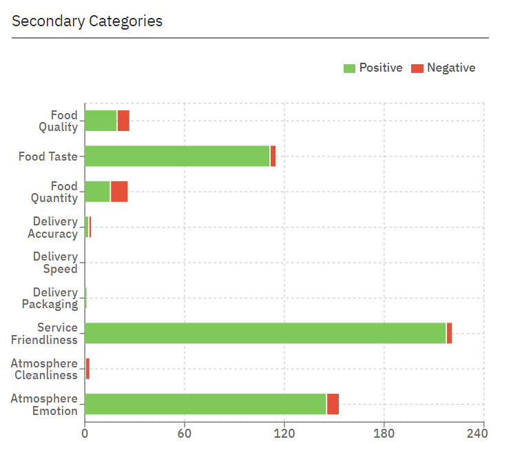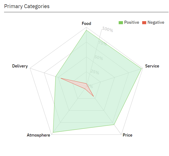 • Automatically categorizes feedback into topics like Delivery, Food, Service, Atmosphere, and Price